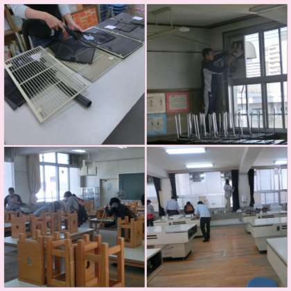 1年生の保護者のみなさんは、多目的室、2年生音楽室、3年生パソコン室、4年生図書室、5年生家庭科室、6年生図工室をそれぞれ清掃してくださいました。