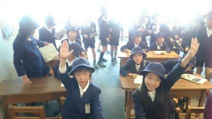初めに広いホールで、昔の道具の実物を見ながらクイズに答えました。また蓄音機でレコードを聴いたり、電気がない時代の人々の暮らしを体験したりしました。