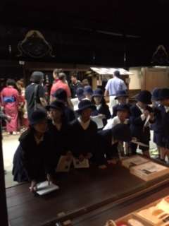 昔の大坂の町も探検しました。靴を脱いで薬屋さんや小間物屋さんに入ることもでき大喜びでした。少し時間が経つと辺りが暗くなり1日の変化も体験できました。