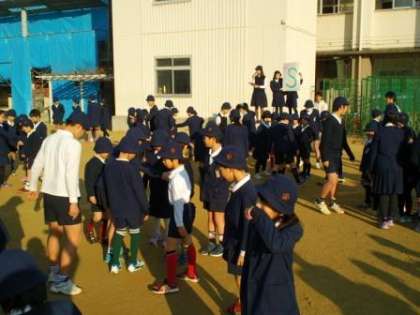 集会委員会の児童がアルファベットを言って、その文字の形をたてわり班のみんなで作り上げていくというものです。