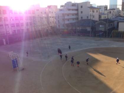 中野小学校自慢の芝生が真っ白に・・・。霜ですね。