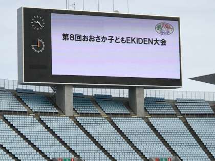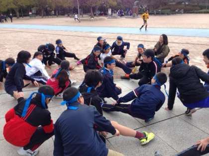 ついにこの日がやって来ました!第8回おおさか子どもEKIDEN大会。ウォーミアップで周回道路とトラックをはしりました。キャプテンが大きな声で盛り上げてくれます。今年は長居のメインスタジアム!すごい!!