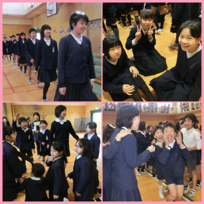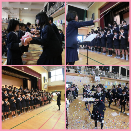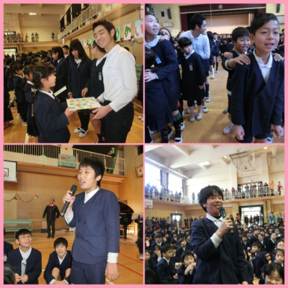 集会委員会がしてくれた「6年生と遊ぼう!」ゲームは、いつも以上に歓声があがり、盛り上がりました。みんなで作ったメッセージの色紙、6年生が真剣に見つめてくれていたのがジーンときました。お祝いのメッセージと歌。涙を流している6年生もいました。歌詞の意味を噛みしめて中学に行ってくださいね。下級生にお礼のプレゼントを渡す6年生。6年生ってこんなに大きかったんだ!いつも優しいけれど、いつも以上に優しい6年生。いただいたプレゼント、大切に使います。