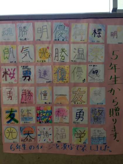 6年生の教室前廊下にこういう掲示物が貼ってありました。5年生からの贈り物のようです。6年生のイメージを漢字で表したそうです。おもしろいレタリングで書かれ、漢字にあったイラストや模様も描かれています。色鮮やかですね。6年生、うれしいね。