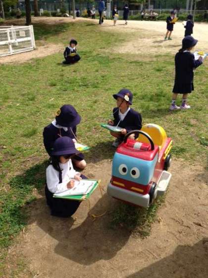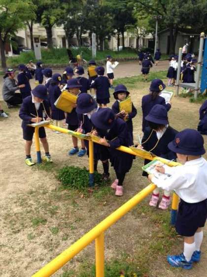 すべり台、砂場、ベンチ、電灯・・・公園にはいろいろなものがあるなあ。発見したら、ワークシートにチェックです。