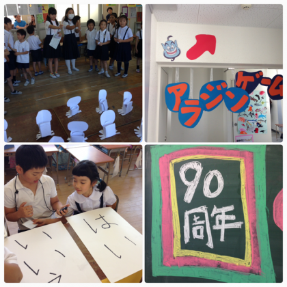 6年生を先頭に楽しそうにお店めぐりをしています。受付や呼び込みの仕事も楽しいね。閉会式のインタビューコーナーでは、「90周年お祝いにぴったりのなかのまつりでした」と答えてくれた人もいます。校長先生からもみんなで協力できたことをほめてもらいました。特に、この後の90周年記念式典にも出席する6年生のがんばりをほめてくださいました。