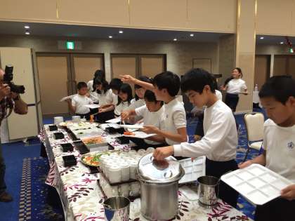 6年生は、宿舎「伊勢志摩ロイヤルホテル」に到着しました。開舎式でお世話になるホテルの皆さんに挨拶をしました。避難訓練を行い待ちに待ったバイキング!夕食です。
