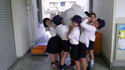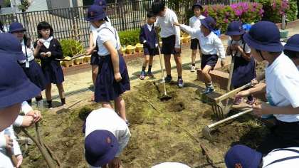 ゴールデンウィークを目前に控え、中野小学校の学習園(畑)があわただしくなってきました。連休後に注文しておいた苗や種がどっと届くのです。すぐに植えるため、各学年が草抜きや肥料やりに汗を流しています。虫にキャーと驚いたり、肥料のにおいを感じたりと楽しみながら作業しました。