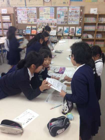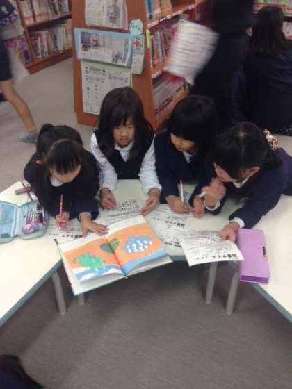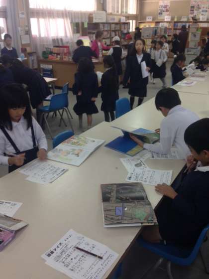 学年ごとに数パターンの読書クイズが配られます。例えば、「『オオサンショウウオの夏』で、ユウスケがであった少年は何年生でしょう。1.一年生 2.四年生 3.六年生」「ライト兄弟は、飛行機を初めて作った人ですが、どんな動物のどんな動きを参考にして機体を安定させたでしょう。」・・・図書室で本をさがして、よく読んでからクイズに答えます。