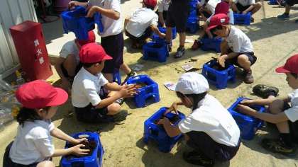 1年生は、ピカピカの植木鉢に肥料と土を入れ、あさがおの種まきです。