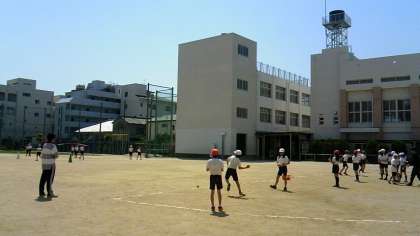 運動場では6年生がおもいきり振りかぶってソフトボールを投げていますよ。