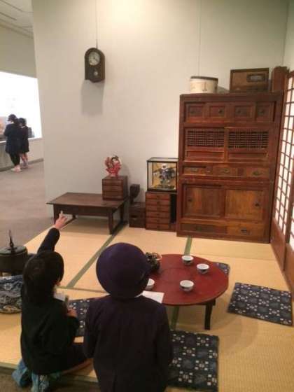 子どもたちにとっては、見たことのない道具ばかり。ローラー式洗濯機に洗濯物をはさんで、くるくる。黒電話のダイヤルをぐるぐる。蚊帳の中に入ってごろごろ。あとで教科書を見たときに、「あ、これ見た!」と思い出してくれることでしょう。