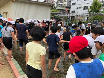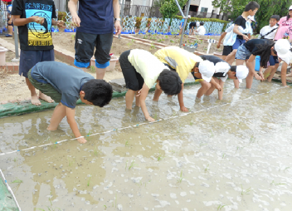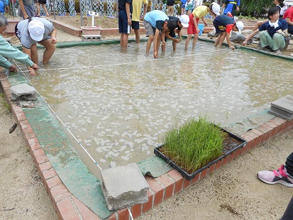 大阪府下で米作りをされている奥田様に来ていただき、稲の植え方について伝授いただきました。まず裸足になって水の中に入り足を使って土慣らしをしました。初めて踏む田んぼの土の感触、足の指の隙間からニュルッと泥が抜けていく感触は独特のものがあります。子どもたちは大興奮でした。
