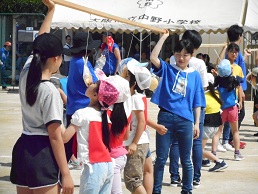 快晴の日曜日、PTAふれあい運動会が開催されました。学校の運動会と違い、パンくい競争でスタートしました。朝ごはん代わりに、またはブランチに、まずはおなかを満たして競技に臨みました。障がい物競走やデカパン競争、クイズやリレー、水でっぽうでオニが背負うポイの的を破るウォーターウォーズなど、楽しいものがたくさんありました。終了後は、おみやげの水でっぽうでみんなで水のかけ合いです。あちらこちらで大きな歓声が響き渡りました。小学生、幼児、保護者のみなさん、そして恒例の卒業した中学1年生がお手伝いにと、多くの参加がありました。