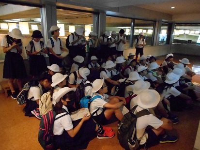 6年生が、大阪城の隣にある大阪歴史博物館へ出かけました。ふだんは入れない地下に案内していただき、建物の地下に保存されている「難波の宮」の遺構を見ました。柱を立てた時の穴が規則正しく並んでいて、建物の大きさがわかります。