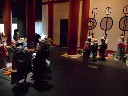 続いて博物館の展示コーナーへ向かいました。大昔の大阪の様子から、難波の宮が栄えた時代、奈良・平安時代の大阪の様子、戦国の世から近世、近代にかけて、さらに現在の大阪と、その移り変わりを学びました。途中にある、大阪のすごろくや土器のパズルなどにもチャレンジしました。お弁当を、広い難波の宮跡で昔を思いながら食べました。