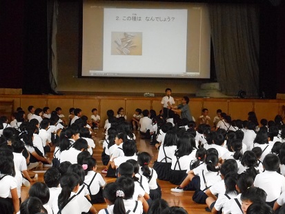 「このタネはなんでしょう」クイズでスタート。みんなが知っている問題や意外と難しい問題など、全部で13のクイズで大いに盛り上がりました。メンバーは、校内の緑化や栽培で活躍しています。