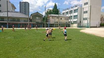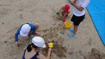 予定していた日が雨だったので、今日になりました。快晴の下、水鉄砲やしゃぼん玉・砂遊びをしました。ストローで上手に吹いて大きなしゃぼん玉を作ったり、うちわでたくさんのしゃぼん玉を作ったりと工夫していました。水鉄砲は、思いっきり走り回って楽しんでいました。砂場では、何を作るかみんなで相談していました。笑顔いっぱいで楽しみました。