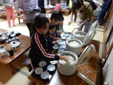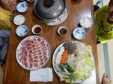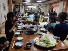 今夜のメニューは かもなべ です。まず、食事係が班のごはんとお茶の用意をします。そして、全員そろって、「いただきまーす」