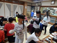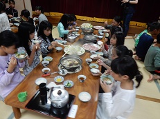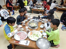 いただきます、をしましたが、かもなべがなかなか煮えません。おなかペコペコに子どもたちは待てません。煮えるまで、漬物で一杯目のご飯を食べました。おかわりも大盛りで、その数は半端ではありません。日頃の給食では見られない、すごい勢いでたいらげました。おなかいっぱいです。なんといっても、元気が何よりです。