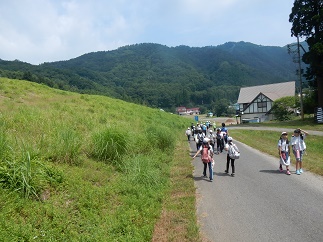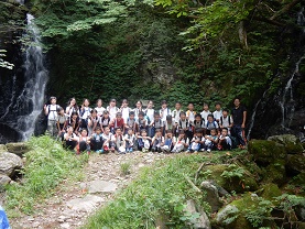 双竜の滝でクラス写真を撮りました。高原のスキー場を通ってひとまず体育館へ。このあと、ジャガイモ掘りに行きます。