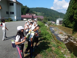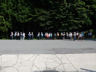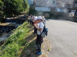 「木の殿堂」でも、思いっきり遊びました。そろそろ、水筒のお茶も底をつきそうです。マイクロバスで宿舎に戻り、冷たいスイカをいただきました。のどの渇きに甘くて水分いっぱいのスイカは格別です。そして、いつもの川に向かってスイカの種飛ばしです。みんな、いつの間にか行儀よく等間隔に並び、川に向かって種を飛ばしました。お家でこんなことをすると、確実におこられます。自然いっぱいの中でこそ、できることですね。