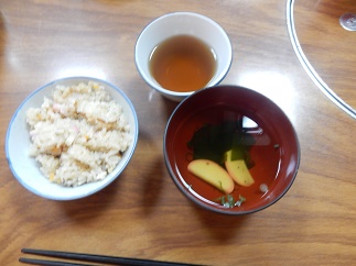 お昼のメニューは、炊き込みご飯です。シンプルですが、これがまたおいしいのです。おかわりの子が殺到しました。予定していた量では足りず、白ご飯とふりかけを急きょ出していただきました。