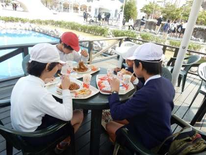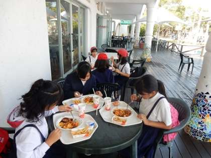 食事風景です。まず食事を済ます班もあれば、真っ先にピレネーへ走る班もありました。でも、みんなで食べるランチは格別です。飲み物をこぼしてしまった子もいました。これも、忘れられない思い出になることでしょう。