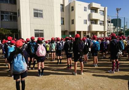 「35億年前の世界へ!みんなであしあとを残す楽しい旅へレッツゴー!」というめあてを確認して1班から順にみんな笑顔で出発しました。