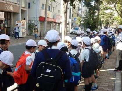 全校児童430名ほどが縦割り班に分かれ、6年生の班長のリードで鶴見緑地に向かいます。電車に一度では乗れません。3回に分けて乗車します。なので、桜ノ宮駅に入るのに、このように待たなければなりません。通行の迷惑にならないように気を付けていますが、多少はご迷惑をおかけすることになります。