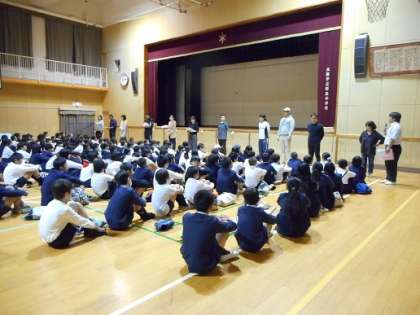 写真は、全体で集まり、各教科の先生の紹介場面です。