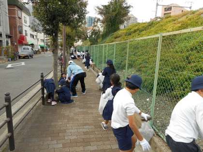 5時間目に、登校班で地域に出かけ、普段通っている道や公園などの掃除をする「中野クリーン作戦」を行いました。今年は土曜ではなく、平日の午後に行いました。まず、運動場に登校班の班長のもとに並びます。今回は、中野連合町会の会長様にお越しいただき、ごあいさつをいただきました。