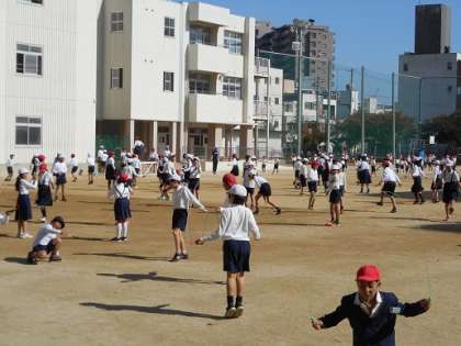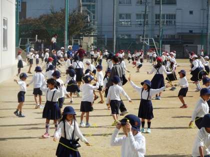 快晴のもと、なかのJumping・Weeksが始まりました。今年は建て替え工事が始まると、全校児童が一斉になわとびをすることができないので、11月に実施しています。忍たまやちびまる子ちゃんなどの曲がかかっている間、飛び続けます。暖かい日差しのもと、すぐに汗が出てくるほどです。運動委員のお姉さんお兄さんが朝会台で見本を見せています。今年は、工事があるため取り組む期間も短いですが、元気いっぱい、健康な体づくりとなわとびの上達に向けて取り組んでいきます。