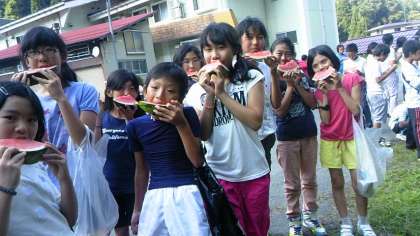 木の殿堂で一息入れて(木のおもちゃが楽しかった!)、三時のおやつは、すいかです。すいか専用の包丁だそうです。