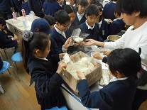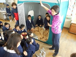 4年生は、避難所での生活体験です。防災グッズにある簡易トイレ、テントや毛布を使った避難生活体験、そして、非常備蓄食のアルファー米の炊き出しと試食をしました。