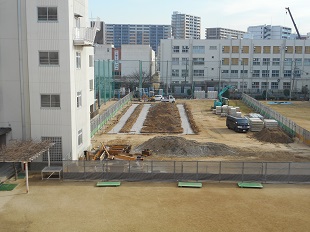 校舎建て替え工事ですが、現在はプレハブ教室の基礎部分ができつつあります。