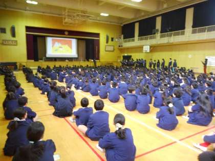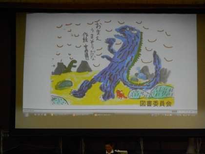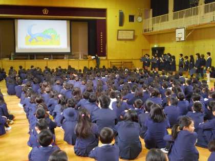 図書委員会の児童が、紙しばい「おまえ うまそうだな」を見せてくれました。ほかの恐竜をおそって食べてしまうティラノザウルスの気持ちの変化が、ジ〜ンと伝わってきました。全校児童は、図書委員が語るお話に引き込まれるように聞き入っていました。