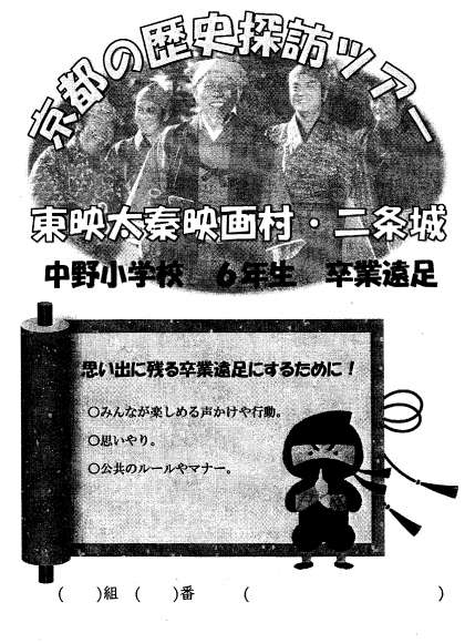 明日は6年生の卒業遠足の日です。太秦(うずまさ)映画村と二条城に行きます。6年生の最後の遠足です。思い出に残る1日となるようにしましょう。