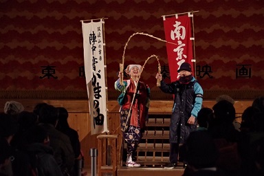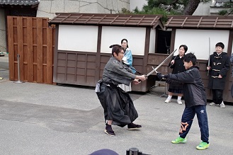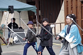 「チャンバラ辻指南」や「南京玉すだれ」では、プロの役者さんの迫力万点の太刀さばきや、リズムよくいつの間にか引き込まれてしまう大道芸のおもしろさを見ました。体験コーナーでは、中野小から3名がチャレンジしました。