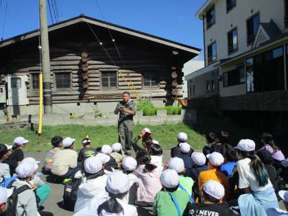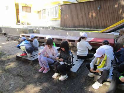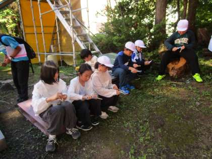 登山の後は、避難訓練をして竹橋づくりです。裂け目の入った竹を割って1本ずつナイフで丁寧に削ります。はじめはなかなかうまくいかなくてぼやき声がたくさん聞かれましたが、だんだん上手になってきてマイ箸の完成です。