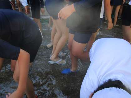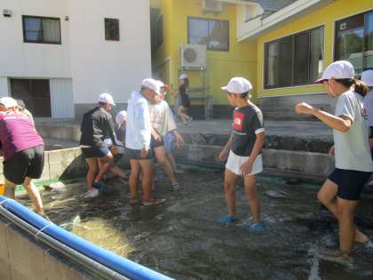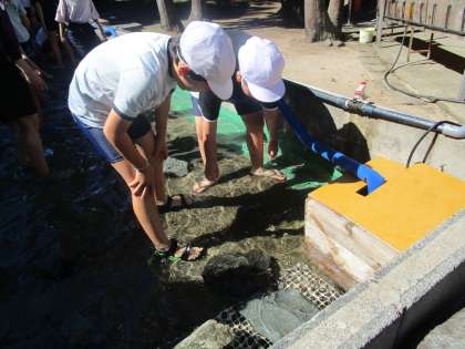 部屋を片付けた後、魚つかみ、ウオータースライダー、焼き板です。焼き板チームと魚つかみチームに分かれてやりました。魚を捕まえた人からウオータースライダーです。魚に逃げられて苦戦している人もいましたが、友だちや先生に助けてもらいながら何とか捕まえることができました。