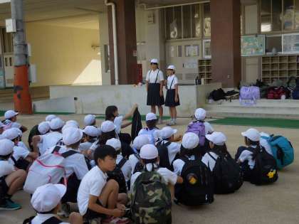 道が空いていて予定より早く帰校しました。帰校式です。1泊2日の短い間でしたが、天気に恵まれ、たくさんの思い出をつくることができました。友だちと協力したり、自分の役割を果たしたりとみんな頑張っていました。何よりも自然に触れることができたことが一番です。昨日はお土産話をたくさん聞いていただけたでしょうか?長い夏休みが続きますが、体調管理をしっかりして元気に過ごしましょう。たくさんのお迎えありがとうございました。