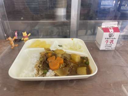 今日の給食は、ビーフカレーライス、野菜のピクルス、りんご(カット缶)です。