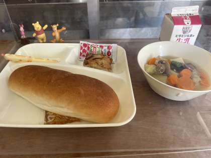 今日の給食は、とうふローフ、洋風煮、棒チーズです。