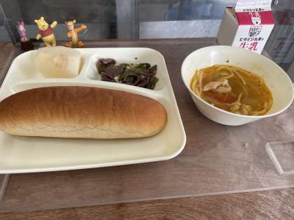 今日の給食は、牛肉の香味焼き、トマトのスープスパゲッティ、なし(二十世紀)です。