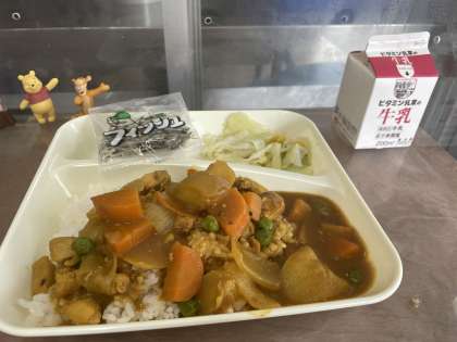 今日の給食は、チキンカレーライス、キャベツとコーンのサラダ、ミニフィッシュです。