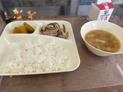 今日の給食は、豚肉の甘辛焼き、みそ汁、かぼちゃのいとこ煮です。