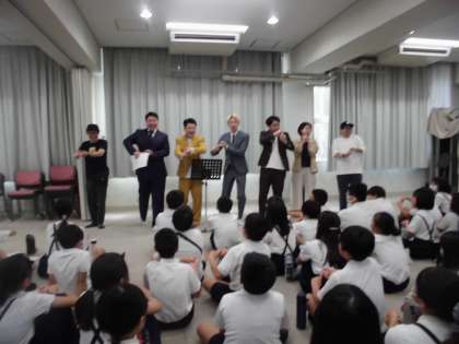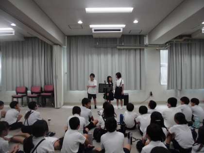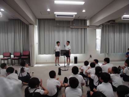今日は、吉本興業の漫才師さんや構成作家さんにゲストティチャーに来ていただいて漫才ワークショップを行いました。事前に選んだ見本の台本に漫才コンビで考えたオリジナルのセリフを入れて練習しました。その後、多目的室で本番でした。緊張しながらも大きな声で動作もつけてそれぞれのコンビのよさを出して発表できました。構成作家さんにもほめていただきました。最後に担任の先生やウイスキーカノンさん、ボロボロバイセコーさんの漫才も見せてもらって楽しい時間でした。