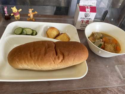 今日の給食は、中華煮、大学いも、あっさりきゅうりです。