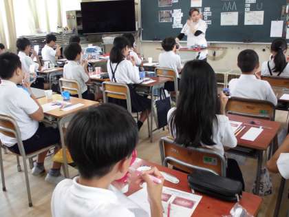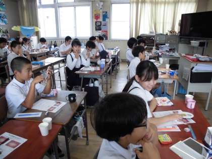 歯を染めてみると、自分が思っているより磨けていないことを知り、みんなびっくりしていました。また、健康な歯茎の人がクラスで一人ぐらいしかいないことも知りました。正しい磨き方を知って鏡を見ながらしっかり磨いていました。